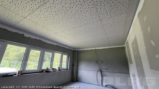 Juli 2024: Die meisten Installationen des Elektrikers sind Anfang Juli soweit abgeschlossen, dass die Firma Hausinger mit der Montage der Deckenkonstruktion im OG beginnen kann. Im ersten Schritt werden die Alu-Profile für die Schattenfuge angebracht, damit wir in diesem Bereich selbst die Wände streichen können. Anschließend wird nach und nach die Decke verschlossen: Während in einigen Räumen kostengünstigere Rasterdecken installiert werden, haben wir uns in den Schulungs- und Aufenthaltsräumen für eine gelochte Gipskartondecke entschieden, die die Räume optisch aufwertet. ... Mehr erfahren