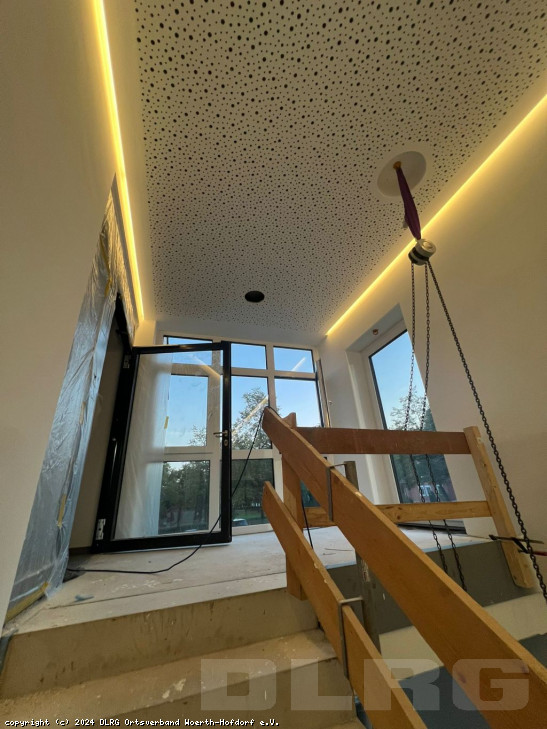 Oktober 2024: Von viel Eigenleistung ist auch der Oktober geprägt, denn: Wir wollen unser neues Heim nach unseren Wünschen gestalten. So bringen wir an der Decke im Nassraum Schienen an, an denen man Gegenstände zum Trocknen aufhängen kann. Im Besprechungsraum verwandeln wir die Wand hinter dem Fernseher mit modernen, schallschluckenden Akkustikpanelen und indirekter Beleuchtung zu einem echten Hingucker. Weil es uns so gut gefällt, gestalten wir auch die Garderobe im Foyer mit den Panelen. Vor dem 25h-Schwimmen, das Ende Oktober stattfindet, wird noch das Treppenhaus fertig gefliest und das Treppengeländer installiert. Auch das Jugend-Einsatz-Team hilft kräftig mit und unterstützt bei einer weiteren Putz-Aktion. ... Mehr erfahren